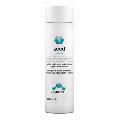 Product Description aquavitro seed will rapidly and safely establish the aquarium biofilter in freshwater and marine systems, thereby preventing the #1 cause of fish death: "new tank syndrome". seed is formulated specifically for the aquarium and contains a synergistic blend of aerobic, anaerobic, and facultative bacteria which facilitate the breakdown of waste organics, ammonia, nitrates and nitrites. Product Benefits Ingredients Suggestions Use Instructions:Shake well before use. Turn off UV/ozone. Use 5 mL for each 40 L (10 US gallons) on the first day with a new aquarium. Then use 5 mL for each 80 L (20 US gallons) daily for 7 days. Fish and other aquatic species may be introduced at any time as long as dosage is maintained for 7 days. For optimum biofilter performance, use 5 mL for each 80 L (20 US gallons) once a month or with each water change and whenever introducing new fish or whenever medicating an aquarium. Special Note Warnings DisclaimerPeta2z.com offers nationally branded products that are produced according to manufacturing standards set by regulators at everyday low prices. Do not use unproven, unbranded products, which can pose serious risks to your health.