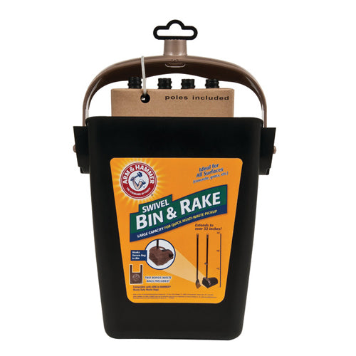 Product Description The Arm & Hammer Swivel Bin & Rake makes an unpleasant yet necessary task even easier. The large capacity pooper scooper is perfect for quick, multi-waste pick-ups and is ideal for picking up the entire yard. The bin & rake works on all surfaces including grass, dirt, pavement or other surfaces. The lightweight handle is ergonomically designed for easy pick-up and adjusts up to 32 inches which eliminates the need to bend kneel or squat to pick up waste. The large capacity durable swivel bin is designed to accommodate and transport pet waste of varying size. Rotating the bin makes disposal a breeze. Includes two plastic bags that are strong and durable and provide natural odor control with activated baking soda providing a fresh scent. Each bag has an easy-tie handle to keep the bin clean. Bags hook to either side of the swivel bin so you never have to touch waste or debris. A completely sanitary solution to picking up pet waste.Two bonus bags are included to get you started, but make sure to pick up additional Arm & Hammer Swivel Bin Pet Waste Bags. The bags are strong and durable, provide natural odor control with activated baking soda and have a fresh scent. The swivel bin waste bags also have easy-tie handles and help to keep the bin clean. Product Benefits Ingredients Suggestions Special Note Warnings DisclaimerPeta2z.com offers nationally branded products that are produced according to manufacturing standards set by regulators at everyday low prices. Do not use unproven, unbranded products, which can pose serious risks to your health.
