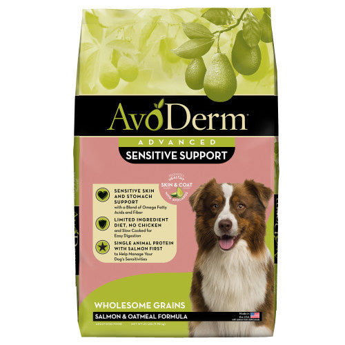 Product Description AvoDerm Advanced Sensitive Support Salmon & Oatmeal Formula is a Limited Ingredient Diet formula that is made with salmon as the only source of animal protein. This formula is an ideal food for dogs that may have food sensitivities or intolerances. It contains a unique blend of oatmeal, pumpkin and fiber to further support easy digestion and omega fatty acids to support sensitive skin. AvoDerm Advanced Sensitive Support Salmon & Oatmeal Formula Dry Dog Food, Specifically Developed For Dogs with Sensitive Skin or Sensitive Stomach. LIMITED INGREDIENT DIET: Salmon is the first ingredient and only source of animal protein. SUPPORTS SENSITIVE STOMACHS - Made with wholesome oatmeal, pumpkin and fiber to support easy digestion. PROMOTES HEALTHY SKIN & COAT: Premium natural dry dog food with added vitamins and minerals made with omega-rich avocados to promote healthy skin, coat, immune system and overall health. QUALITY INGREDIENTS: Wheat free, corn free, soy free, chicken free, pea free. No by-products meals, no artificial flavors, colors or preservatives. Product Benefits Ingredients Suggestions Special Note Warnings DisclaimerPeta2z.com offers nationally branded products that are produced according to manufacturing standards set by regulators at everyday low prices. Do not use unproven, unbranded products, which can pose serious risks to your health.