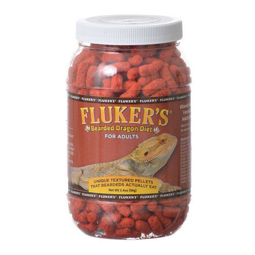 Product Description Flukers Adult Bearded Dragon Diet contains a rich combination of highly digestible animal and plant sources, providing your pet with a healthy balance of necessary protein, fat, vitamins and minerals. These nutritious pellets feature a unique texture and flavor bearded dragons can't resist. Excellent source of essential nutrients Made with plant and animal ingredients Unique textured pellets that bearded dragons actually eat Bearded Dragons, like us, need a certain amount of calories per day for health and vitality. Flukers Adult diet is scientifically formulated to meet these needs. For young dragons, feed Flukers Juvenile Formula Bearded Dragon Diet.Feeding Directions: Offer 8-12 pellets a day for small adults, and up to 22 pellets a day for large adults. Offer fresh food daily. Disinfect water consumption. Dietary diversity is important. Flukers recommends supplementing this diet with live foods such as crickets and mealworms, and fresh greens (eg. Romaine lettuce) as desired.Guaranteed Analysis:Crude Protein (min) - 24.0%Crude Fat/Oil (min) - 8.0%Crude Fiber (max) - 3.5%Moisture (max) - 10.0%Ash (max) - 9.0%Vitamin A (min) - 19,000 IU/kgVitamin D3 (min) - 800 IU/kgVitamin E (min) - 200 IU/kgCopper (min) - 10 mg/kg Product Benefits Ingredients Suggestions Special Note Warnings DisclaimerPeta2z.com offers nationally branded products that are produced according to manufacturing standards set by regulators at everyday low prices. Do not use unproven, unbranded products, which can pose serious risks to your health.