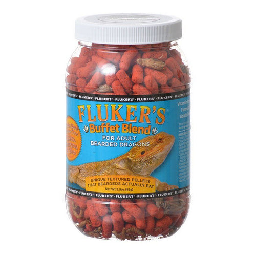 Product Description Flukers Buffet Blend Adult Bearded Dragon Food contains a highly nutritious blend of vitamin-enriched pellets, freeze-dried crickets, and freeze-dried mealworms to provide an optimal balance of nutrients. The pellets feature a unique texture and flavor bearded dragons can't resist. Provides proper balance of protein, fat, vitamins and minerals A perfect blend of freeze-dried crickets, mealworms and pellets Unique textured pellets that bearded dragons actually eat Made in the USA For adults only. For young bearded dragons, feed Flukers Buffet Blend for Juvenile Bearded Dragons.Feeding Directions: Offer 8-12 pellets a day for small adults, and up to 22 pellets a day for large adults. Offer fresh food daily. Disinfect food and water bowls daily. Food can be moistened to help increase daily water consumption. Dietary diversity is important. We recommend supplementing this diet with live foods such as crickets and mealworms, and fresh greens (e.g. Romaine lettuce) as desired.Guaranteed Analysis:Crude Protein (min) - 29.0%Crude Fat/Oil (min) - 6.0%Crude Fiber (max) - 5.5%Moisture (max) - 9.5%Calcium (min) - 1.0%Ash (max) - 8.5% Product Benefits Ingredients Suggestions Special Note Warnings DisclaimerPeta2z.com offers nationally branded products that are produced according to manufacturing standards set by regulators at everyday low prices. Do not use unproven, unbranded products, which can pose serious risks to your health.