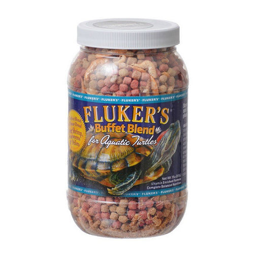 Product Description Flukers Buffet Blend for Aquatic Turtles is a tasty, nutrient-rich blend of freeze-dried river shrimp, freeze-dried mealworms, and vitamin-enriched pellets. It is specially designed to deliver the proper balance of essential protein, fat, vitamins, and minerals for aquatic turtles. Complete balanced nutrition for aquatic turtles A perfect blend of freeze-dried river shrimp, mealworms and pellets Vitamin enriched formula Ideal for juvenile and adult aquatic turtles. Made in the USA.Feeding Directions: Feed juvenile or adult turtles one time per day, three to five times per week. For best results, feed only the amount of Buffet Blend that the turtles will consume in one day. The buffet blend should be scattered on the water, where it will float. The turtles will eat this for 15 to 20 minutes and then bask for a period of time. The remaining food will break up and sink to the bottom. The turtles will return later to continue feeding.Guaranteed Analysis:Crude Protein (min) - 40.0%Crude Fat (min) - 8.25%Crude Fiber (max) - 2.5%Moisture (max) - 5.5%Calcium (min) - 4.5%Ash (max) - 13.5% Product Benefits Ingredients Suggestions Special Note Warnings DisclaimerPeta2z.com offers nationally branded products that are produced according to manufacturing standards set by regulators at everyday low prices. Do not use unproven, unbranded products, which can pose serious risks to your health.
