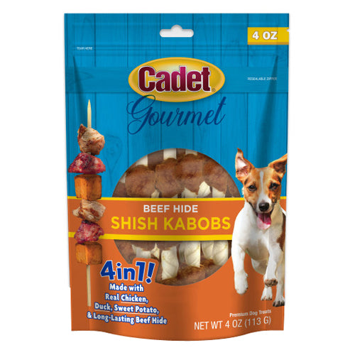 Product Description For over 30 years, Cadet has been providing naturally delicious dog chews and treats. Cadet Gourmet Beef Hide Shish Kabob dog treats are an irresistible reward! Made with premium-quality ingredients, these low fat dog treats take long lasting beef hide and wrap it with real proteins and nutritious sweet potato for a delicious chewing experience. Each shish kabob is crafted with natural, limited ingredients and does not contain any artificial colors, fillers, or flavors. Plus, they help clean teeth and gums as dogs chew to promote a healthy smile. Whether you’re occupying your furry family member or just giving them a special reward, these dog chew treats will keep your Cadet happy! LOW FAT AND HIGH PROTEIN - Healthy dog treats made with real ingredients to support overall wellness. SUPPORTS DOG ORAL HEALTH - Rawhide chews help clean teeth and gums through natural chewing action. LONG LASTING DOG TREATS - Perfect for occupying and rewarding well-behaved furry friends. NATURAL DOG TREATS - Made with no artificial colors, fillers, or flavors. INSPECTED AND TESTED IN THE USA - All Cadet chews and treats undergo a rigorous inspection process to guarantee they meet our high standards. SIZE - Extra-large kabobs are longer and thicker for even more chewing fun. COUNT - Contains two 10-inch treats. SAVORY FLAVOR MEDLEY - Limited-ingredient dog treats feature real chicken, chicken liver, and sweet potato wrapped around savory beef hide. Product Benefits Ingredients Suggestions Special Note Warnings DisclaimerPeta2z.com offers nationally branded products that are produced according to manufacturing standards set by regulators at everyday low prices. Do not use unproven, unbranded products, which can pose serious risks to your health.