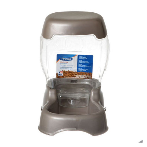 Product Description Make feeding time easy and save time with the Petmate Pet Café Feeder. This stylishly designed gravity feeder replenishes the food reservoir when levels get low. Features a food storage hopper with an extra-wide mouth and removable lid making the Pet Café Feeder easy-to-clean and refill. The fashionable base features easy-grab handles making the feeder easy to maneuver and comes in a variety of colors to complement any home decor. Uses more environmentally sustainable PET vs. PVC Bottles. Pet parents choose from an assortment of sizes. Small: 3 lb capacity, Medium: 6 lb capacity, Large: 12 lb capacity. Made in the USA. Product Benefits Ingredients Suggestions Special Note Warnings DisclaimerPeta2z.com offers nationally branded products that are produced according to manufacturing standards set by regulators at everyday low prices. Do not use unproven, unbranded products, which can pose serious risks to your health.