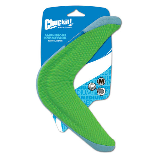 Product Description Take fetch from land to sea with the Chuckit! Amphibious Boomerang. Soft, semi-rigid construction is designed for exceptional visibility and performance for hours of fun. Unsinkable and floats high on the water yet light enough to fly high in the air. The soft yet durable material is easier on your dogs' mouth. Easy to clean after a day of fun filled fetch. Ships in assorted colors. Product Note: For supervised play only. Know your dog and choose the appropriate size and type of toy to prevent choking or other harm. Inspect this toy regularly; if toy is damaged or if parts become separated, remove toy and parts as injury may result. Not a child's toy. Product Benefits Ingredients Suggestions Special Note Warnings DisclaimerPeta2z.com offers nationally branded products that are produced according to manufacturing standards set by regulators at everyday low prices. Do not use unproven, unbranded products, which can pose serious risks to your health.