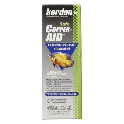 Product Description Kordon Copper-Aid External Parasite Treatment is a safe, efficient and effective treatment for the most common external parasites in your aquarium. Its non-staining formula eliminates Ich, velvet, anchor works, flukes, and other parasites that can harm your fish. Copper Aid protects the tank for one full month and can be used in fresh and saltwater aquariums. Non-staining Protects tank for 1 full month For fresh and saltwater aquariums 4oz treats 100 gallons of water Effective treatment for Ich, velvet, anchor works, flukes and other external parasites Directions for Use: As a treatment for Ich, Velvet and to aid in general external parasite disease prevention, add 1 teaspoon (5 ml) per 4 gallons of water. Treats water for 1 month. Product Benefits Ingredients Suggestions Special Note Warnings DisclaimerPeta2z.com offers nationally branded products that are produced according to manufacturing standards set by regulators at everyday low prices. Do not use unproven, unbranded products, which can pose serious risks to your health.