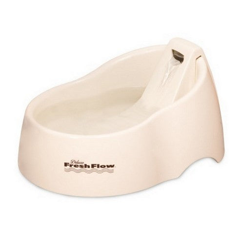 Product Description Did you know that some cats refuse to drink water if it's been in their bowl for over a day? The Petmate Deluxe Fresh Flow is a purifying pet fountain providing free-flowing filtered water throughout the day for your cat. Perfect for multiple cat households, this award-winning fountain features continuous circulating water and a unique, no-splash waterslide. The re-circulating flow and filter provide naturally cool and oxygenated water, attracting pets to drink more in order to help promote their health and well-being. The AC adapter plugs into any standard household outlet. Each unit includes two replaceable charcoal filters. To ensure freshness we recommend that the filter be changed every thirty days. Product Benefits Ingredients Suggestions Use Instructions: Pump may take 2-3 minutes before it begins circulating water. This allows time for air to be removed from pump. The pump is silent. You will not hear anything except the flowing of water down the slope.Mineral build-up from tap water or water from other sources can ruin the pump. If hard water is a problem, bottled water is recommended. The pump may need occasional cleaning to remove build up, especially when using hard water. If debris is caught in the intake vents of the pump, disconnect the pump from any power sources and rinse the pump under clean running water. Check strainer and intake vents once a week for pet hair and debris. Remove as needed.Always unplug unit before performing any type of maintenance.Filter Maintenance: Check charcoal filter after two weeks. Replace filter once a month for usage by one pet. Homes with multiple pets will require more frequent replacement.Cleaning: Bowl, reservoirs and all plastic parts may need to be cleaned with mild dish soap. Do not place in dishwasher.Damage: Inspect all plastic parts at this time for cracks or damage that could facilitate water leaking onto floor.Adding Water: Add water to storage reservoir when it appears low. You must remove the reservoir to add water to it. Water may also be added to bowl by pouring slowly from a cup directly into the bowl.Pump Cleaning: Unplug unit. Remove pump intake top cover. Use fingernail to pry second cover up. Remove second cover. Remove impeller. Soak in solution of two parts vinegar and one part water for 2-3 hours. Clean impeller with Q-tip. Rinse well and reassemble. Care and Cleaning Instructions: Bowl, reservoirs and all plastic parts may need to be cleaned with mild dish soap. Do not place in dishwasher.1. Unplug unit. Remove pump intake top cover. 2. Use fingernail to pry second cover up. 3. Remove second cover. 4. Remove impeller. (May need tweezers) It is only held in by magnetic force.5. Soak in solution of 2 parts vinegar and 1 part water for 2-3 hours. Clean impeller tunnel with Q-tip. Rinse well; re-assemble wet. Special Note Warnings DisclaimerPeta2z.com offers nationally branded products that are produced according to manufacturing standards set by regulators at everyday low prices. Do not use unproven, unbranded products, which can pose serious risks to your health.