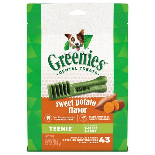 Product Description Supports dental care for small dogs made with natural ingredients plus vitamins, minerals, and nutrients for small breed dogs between 5-15 pounds, greenies teenie natural dog dental treats help clean teeth and freshen breath Veterinarian. Recommended dog treats with a unique texture that cleans down to gumline to help fight plaque and tartar, these dental chews are veterinarian recommended for at-home dog dental care made with real sweet potato. Product Benefits Delightfully Chewy Texture That Fights Plaque And Tartar. Irresistibly Tasty And Incredibly Powerful. Recommended By Veterinarians For At Home Oral Care. Made With Highly Soluble Ingredients That Are Easy To Digest. Helps Promote Overall Health. Ingredients Suggestions Special Note Warnings DisclaimerPeta2z.com offers nationally branded products that are produced according to manufacturing standards set by regulators at everyday low prices. Do not use unproven, unbranded products, which can pose serious risks to your health.