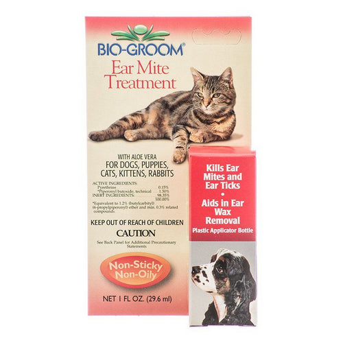 Product Description Bio Groom Ear Mite Treatment is for Dogs, Puppies, Cats, Kittens, and Rabbits. Here is a superb lotion containing Pyrethrins, natures own safe insecticide, and Aloe Vera for sensitive skin. Ear Mite Treatment effectively kills ear mites and ear ticks, plus aids in the removal of ear wax It is non-oily, non sticky, all- natural, and biodegradable Safe for pets as well as the environment Ingredients: Pyrethrins, piperonyl butoxide techincal.Instructions:Apply 10 drops to each ear and massage the base of ear a few minutes to assist penetration of the ear wax by the solution. Allow pet to shake its head and wipe excess solution from the ear with cotton.Repeat every two days until condition has cleared up or as directed by your veterinarian. As a preventative treatment, apply this solution every 15 days.NOTE: Do not use on dogs, puppies, kittens, cats or rabbits under 12 weeks of age. Product Benefits Ingredients Suggestions Special Note Warnings DisclaimerPeta2z.com offers nationally branded products that are produced according to manufacturing standards set by regulators at everyday low prices. Do not use unproven, unbranded products, which can pose serious risks to your health.