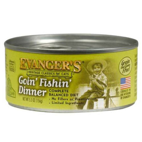 Product Description Give your kitty the fishy deliciousness he craves with the Evanger's Classic Recipes Goin' Fishin' Dinner Grain-Free Canned Cat Food. A feline fish lover’s dream, the formula provides plenty of protein to fuel all those adventures, made with salmon as the first ingredient and rounded off with wholesome butternut squash. Every juicy bite is loaded with all the nutrients your pal needs to look and feel his best, like vitamins, omegas and taurine, not to mention the straight-from-the-skillet flavor he’ll find irresistible! With limited ingredients and no grains, gluten or anything artificial, kitties with sensitivities can dive into the bowl, too. Pea free. Gluten free. High protein. Natural Omegas. Made in the USA. Product Benefits Ingredients Suggestions Special Note Warnings DisclaimerPeta2z.com offers nationally branded products that are produced according to manufacturing standards set by regulators at everyday low prices. Do not use unproven, unbranded products, which can pose serious risks to your health.