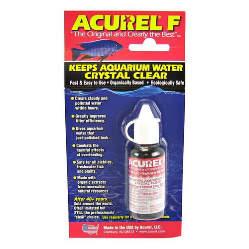 Product Description Acurel F Aquarium Clarifier clears cloudy, polluted water within hours. By removing suspended particles that make your water dirty, it not only gives aquarium water that "just polished" look, it also greatly improves filter efficiency. Clears cloudy and polluted water within hours Greatly improves filter efficiency Safe for all cichlids, freshwater fish and plants Acurel F is made with organic extracts from renewable natural resources, and is safe for all cichlids and freshwater fish and plants. By removing suspended particles, it helps combat the harmful effects of overfeeding for better fish health. Enjoy clear water at all times!Made in the USA. Product Benefits Ingredients Suggestions Special Note Warnings DisclaimerPeta2z.com offers nationally branded products that are produced according to manufacturing standards set by regulators at everyday low prices. Do not use unproven, unbranded products, which can pose serious risks to your health.