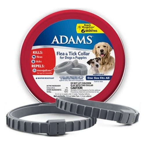 Product Description Adams Flea and Tick Collars for Dogs and Puppies protect your pet from pests for up to 6 months each! These water-resistant, one-size-fits-all adjustable collars kill fleas and ticks and repel mosquitoes, no drops or sprays required. Kills fleas & ticks & repels mosquitoes for up to 6 months Water resistant Adjustable, one size fits all 2 collars provide up to 12 months protection Product Benefits Ingredients Suggestions Special Note Warnings DisclaimerPeta2z.com offers nationally branded products that are produced according to manufacturing standards set by regulators at everyday low prices. Do not use unproven, unbranded products, which can pose serious risks to your health.