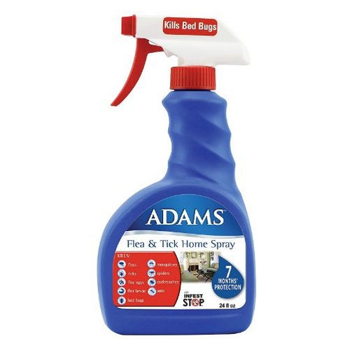 Product Description Adams Flea & Tick Home Spray protects your home from infestations by killing fleas, ticks, cockroaches, ants, spiders, mosquitoes, and other insects. It reaches fleas hidden in carpets, rugs, upholstery and pet bedding. It protects your home from flea build-up while protecting your pets and family from bites. One treatment gives continuous protection against pre-adult fleas for up to 7 months. Starts Killing in 5 Minutes Kills Fleas, Ticks, Mosquitoes, Spiders, Cockroaches, Ants and more Up to 7 months Protection Against Fleas, Flea Eggs And Flea Larvae Not for use Directly on Pets Contains an Insect Growth Regulatory (IGR) to Kill Flea Eggs and Larvae INSTRUCTIONS: For fleas: One bottle will treat a surface area equivalent to approximately thee 10 'X 11.5' rooms. A fine spray applied uniformly is all that is necessary to kill fleas. do not wet furniture and carpeting. Remove birds and cover aquariums before spraying. For maximum effectiveness, treat the entire carpeted area. Treat carpets, rugs, drapes, and all surfaces of upholstered furniture. Remove old pet bedding and replace it with clean fresh bedding after treatment of the pet area. Reapply every 2 weeks if necessary. Vacate treated areas and do not return for at least one hour. Avoid contamination of food and foodstuffs. Do not use in the edible product areas of food processing plants, restaurants, or other areas where food is commercially prepared, processed, stored. or served.INGREDIENTS: Active Ingredients:(S)-Methoprene (CAS #65733-16-6) ... 0.01%.Etofenprox (CAS #80844-07-01) ... 0.50%.Piperonyl Butoxide (CAS #51-03-6) ... 2.00%.Other Ingredients: ... 97.49%.Total ... 100.00%.(Butyl Carbityl) (6-Propylpiperonyl) Ether and Related Compounds.(S)-Methoprene. Product Benefits Ingredients Suggestions Special Note Warnings DisclaimerPeta2z.com offers nationally branded products that are produced according to manufacturing standards set by regulators at everyday low prices. Do not use unproven, unbranded products, which can pose serious risks to your health.