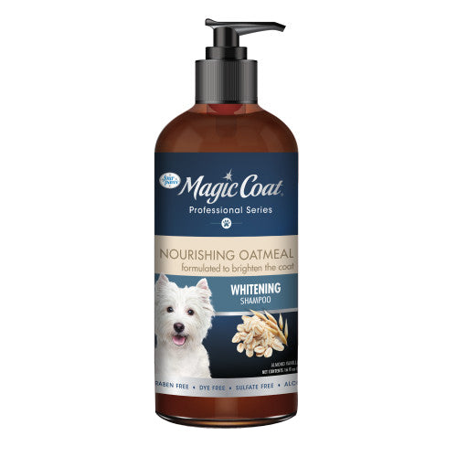 Product Description Four Paws has been simplifying at-home pet grooming with the highest-quality tools and products for over 50 years. Elevate your dog's at-home grooming experience with Magic Coat Professional Series Nourishing Oatmeal Dog Whitening Shampoo! Enriched with oatmeal to relieve itchiness, this dog shampoo features baking soda to naturally brighten light-colored coats and deodorize fur. Formulated with a pH-balanced blend of coconut- and plant-based ingredients, this almond vanilla-scented shampoo is free of DEA, MEA, phthalate, parabens, dye, sulfates, alcohol, soap, and silicone. Use this USA-made shampoo on any coat type—including cats! WITH NOURISHING OATMEAL - Enriched with the power of oatmeal to gently relieve itchiness and revitalize the coat. FORMULATED TO BRIGHTEN COAT - Deodorizing dog shampoo features baking soda to naturally brighten light-colored coats and help eliminate odors. FINEST-QUALITY INGREDIENTS - pH-balanced dog oatmeal shampoo is free of DEA, MEA, phthalate, parabens, dye, sulfates, alcohol, soap, and silicone. FOR ALL SKIN AND COAT TYPES - Pet shampoo is recommended for both dogs and cats. USA-MADE SHAMPOO - Made in the United States with globally sourced ingredients. SCENT - Almond vanilla. CONVENIENT PUMP DISPENSER - Helps minimize messes and spills. SIZE - Contains 16 fluid ounces. Product Benefits Ingredients Suggestions Special Note Warnings DisclaimerPeta2z.com offers nationally branded products that are produced according to manufacturing standards set by regulators at everyday low prices. Do not use unproven, unbranded products, which can pose serious risks to your health.