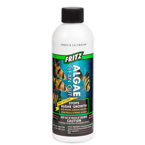 Product Description Fritz Algae Clean Out is the most concentrated EPA registered algaecide formula available. Product Benefits Ingredients Suggestions Use Instructions:Use 6 drops per 10 U.S. gallons (37.85 L). Use 18 drops (½ tsp/½ cap) per 30 U.S. gallons (114L). Use 5 ml (1 tsp/1 cap) per 60 U.S. gallons (227.1 L). Add recommended dosage near the filter outflow to mix into aquarium water rapidly. Remove dead algae from aquarium. Repeat dose every three days until algae is controlled. Special Note Warnings DisclaimerPeta2z.com offers nationally branded products that are produced according to manufacturing standards set by regulators at everyday low prices. Do not use unproven, unbranded products, which can pose serious risks to your health.