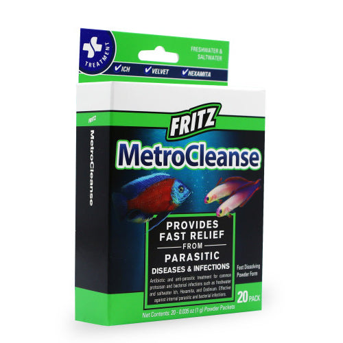 Product Description Fritz MetroCleanse is a safe and effective antibiotic and anti-parasitic treatment for several common protozoan and bacterial infections such as freshwater and saltwater Ich, Hexamita, and Oodinium, and is also effective against internal parasitic and bacterial infections. It can be used safely in a medicated food mix for use in systems containing invertebrates. Fritz MetroCleanse will not affect beneficial bacteria, and is non toxic even if overdosed. Effective Against Internal and External Parasitic Infections. Treats Ich, Hexamita, and Oodinium. Easy Packet Dosing System. Safe for Fresh and Saltwater Systems. Product Benefits Ingredients Suggestions Battery Required:No Batteries Included?:No Use Instructions:Refer to product packaging Special Note Warnings DisclaimerPeta2z.com offers nationally branded products that are produced according to manufacturing standards set by regulators at everyday low prices. Do not use unproven, unbranded products, which can pose serious risks to your health.