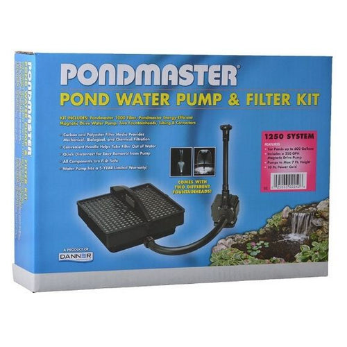 Product Description Pondmaster Filter System Kits combine the easy-to-use PondMaster Filter Box with a high-tech fully submersible Mag-Drive water pump. In this submersible pond filter water is drawn into a coarse filter pad to trap debris, then through a finer, carbon-impregnated pad to further purify the water. Quick and easy installation Sits conveniently at the bottom of your pond Fountain head can be detached to attach to a waterfall feature if desired Made in the USA Filter media is included. A sturdy handle allows the filter to be placed where needed and easily removed for cleaning. UL-listed for safety.Includes: Filter Box, Mag Drive Pump, 2 Fountain Heads, Vinyl Tubing, All Fittings, Poly, and Carbon Filter Pads.Models:190: Ponds up to 400 Gallons (190 GPH Max Flow) - NOTE: Suitable for Small to Medium Ponds and Containers.1250: Ponds up to 600 Gallons (250 GPH Max Flow)1350: Ponds up to 800 Gallons (350 GPH Max Flow)1500: Ponds up to 1,000 Gallons (500 GPH Max Flow)1700: Ponds up to 1,250 Gallons (700 GPH Max Flow)Pondmaster Pond Water Pump and Filter Kit Specifications:Fountain Head Height: 19" Tall (may be cut to desired length)Models 190-1250: 10' Long CordModels 1350-1700: 18' Long Cord5 Year Manufacturer Warranty Product Benefits Ingredients Suggestions Special Note Warnings DisclaimerPeta2z.com offers nationally branded products that are produced according to manufacturing standards set by regulators at everyday low prices. Do not use unproven, unbranded products, which can pose serious risks to your health.