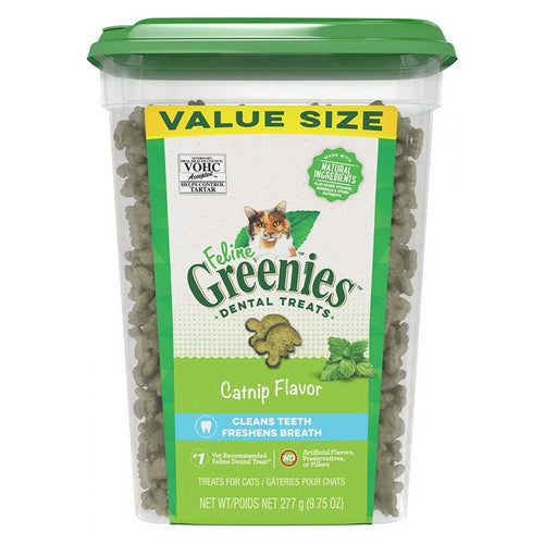 Product Description FELINE GREENIES Catnip Flavor Dental Cat Treats were designed to help keep your cat’s teeth clean and healthy. The crunchy texture of these irresistible cat snacks helps clean teeth, reduce tartar buildup, and freshen cat breath, letting you enjoy cuddle time even more. Made with natural ingredients plus vitamins, minerals, and other nutrients, these tasty natural dental treats are nutritionally complete and balanced for adult cats. Plus, FELINE GREENIES Dental Treats contain less than 2 calories per treat and are the #1 vet recommended feline dental treat.* For some healthy play, try placing a few cat treats inside a treat dispenser toy and watch your cat chase and swat away. Give your cat FELINE GREENIES Dental Treats, and you're sure to hear happy purrs of joy. FELINE GREENIES Daily Dental Treats... for healthy and happy dental care. * Among U.S. veterinarians who recommend dental treats for at-home oral care This bulk tub contains 9.75 oz. of FELINE GREENIES Crunchy Dental Treats in Catnip Flavor. Crunchy texture helps clean teeth, reduce tartar buildup, and freshen breath. The #1 vet-recommended feline dental treat*. Made with natural ingredients plus vitamins, minerals, and other nutrients; nutritionally complete and balanced for adult cats. This tasty cat treat has no artificial flavors, has no artificial preservatives, and contains less than 2 calories per treat. Dental Care. Natural. Product Benefits Ingredients Suggestions Special Note Warnings DisclaimerPeta2z.com offers nationally branded products that are produced according to manufacturing standards set by regulators at everyday low prices. Do not use unproven, unbranded products, which can pose serious risks to your health.