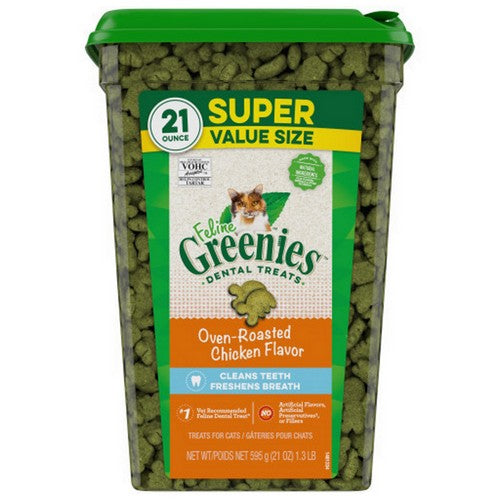 Product Description FELINE GREENIES Oven Roasted Chicken Flavor Dental Cat Treats were designed to help keep your cat’s teeth clean and healthy. The crunchy texture of these irresistible cat snacks helps clean teeth, reduce tartar buildup, and freshen cat breath, letting you enjoy cuddle time even more. Made with natural ingredients plus vitamins, minerals, and other nutrients, these tasty treats are also nutritionally complete and balanced for adult cats. Plus, FELINE GREENIES Dental Treats contain less than 2 calories per treat and are the vet-recommended feline dental treat.* Give your cat FELINE GREENIES Dental Treats and you're sure to hear happy purrs of joy. FELINE GREENIES Daily Dental Treats. for healthy and happy dental care. * Among U.S. veterinarians who recommend dental treats for at-home oral care. This bulk tub contains 21 oz. of FELINE GREENIES Crunchy Dental Treats in Oven Roasted Chicken Flavor. Crunchy texture helps clean teeth, reduce tartar buildup, and freshen breath. The vet-recommended feline dental treat*. Made with natural ingredients plus vitamins, minerals, and other nutrients; nutritionally complete and balanced for adult cats. This tasty cat treat has no artificial flavors, has no artificial preservatives, and contains less than 2 calories per treat. Dental Care. Natural. Product Benefits Ingredients Ingredients: Chicken Meal;Ground Wheat;Brewers Rice;Corn Gluten Meal;Poultry Fat (preserved with Mixed Tocopherols);Oat Fiber;Natural Flavor;Ground Flaxseed;Brewers Dried Yeast;Potassium Chloride;Calcium Carbonate;Salt;Choline Chloride;Citric Acid (a preservative);Fruit Juice Color;Taurine;DL-Methionine;Mixed Tocopherols (a preservative);Vitamin E Supplement;Ferrous Sulfate;Turmeric Color;Zinc Sulfate;Niacin Supplement;Zinc Oxide;Copper Sulfate;D-Calcium Pantothenate (Vitamin B5);Vitamin A Supplement;Thiamine Mononitrate (Vitamin B1);Manganous Oxide;Riboflavin Supplement (Vitamin B2);Pyridoxine Hydrochloride (Vitamin B6);Biotin;Vitamin B12 Supplement;Vitamin D3 Supplement;Sodium Selenite;Folic Acid;Calcium Iodate;Cobalt Carbonate;Rosemary Extract. Suggestions Storage Instructions: To help maintain freshness, we recommend sealing the bag tightly and storing in a cool, dry location. Feeding Instructions: FELINE GREENIES Dental Treats are formulated for cats 1 year of age or older. For a healthy dental benefit, feed a 10 lb adult cat 8 treats, two times per day in conjunction with your cat's regular diet. Adjust the amount of main meal to compensate for calories delivered by treats. Always monitor your pet while feeding treats. Provide fresh drinking water at all times and see your veterinarian regularly. To help maintain freshness, we recommend closing the lid tightly and storing in a cool, dry location. Special Note Warnings DisclaimerPeta2z.com offers nationally branded products that are produced according to manufacturing standards set by regulators at everyday low prices. Do not use unproven, unbranded products, which can pose serious risks to your health.