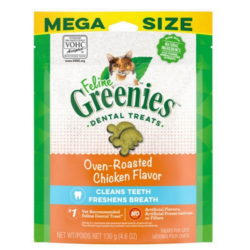 Product Description FELINE GREENIES Oven Roasted Chicken Flavor Dental Cat Treats were designed to help keep your cat’s teeth clean and healthy. The crunchy texture of these irresistible cat snacks helps clean teeth, reduce tartar buildup, and freshen cat breath, letting you enjoy cuddle time even more. Made with natural ingredients plus vitamins, minerals, and other nutrients, these tasty treats are also nutritionally complete and balanced for adult cats. Plus, FELINE GREENIES Dental Treats contain less than 2 calories per treat and are the vet-recommended feline dental treat.* Give your cat FELINE GREENIES Dental Treats and you're sure to hear happy purrs of joy. FELINE GREENIES Daily Dental Treats. for healthy and happy dental care. * Among U.S. veterinarians who recommend dental treats for at-home oral care. This bulk tub contains 21 oz. of FELINE GREENIES Crunchy Dental Treats in Oven Roasted Chicken Flavor. Crunchy texture helps clean teeth, reduce tartar buildup, and freshen breath. The vet-recommended feline dental treat*. Made with natural ingredients plus vitamins, minerals, and other nutrients; nutritionally complete and balanced for adult cats. This tasty cat treat has no artificial flavors, has no artificial preservatives, and contains less than 2 calories per treat. Dental Care. Natural. Product Benefits Ingredients Ingredients: Chicken Meal;Ground Wheat;Brewers Rice;Corn Gluten Meal;Poultry Fat (preserved with Mixed Tocopherols);Oat Fiber;Natural Flavor;Ground Flaxseed;Brewers Dried Yeast;Potassium Chloride;Calcium Carbonate;Salt;Choline Chloride;Citric Acid (a preservative);Fruit Juice Color;Taurine;DL-Methionine;Mixed Tocopherols (a preservative);Vitamin E Supplement;Ferrous Sulfate;Turmeric Color;Zinc Sulfate;Niacin Supplement;Zinc Oxide;Copper Sulfate;D-Calcium Pantothenate (Vitamin B5);Vitamin A Supplement;Thiamine Mononitrate (Vitamin B1);Manganous Oxide;Riboflavin Supplement (Vitamin B2);Pyridoxine Hydrochloride (Vitamin B6);Biotin;Vitamin B12 Supplement;Vitamin D3 Supplement;Sodium Selenite;Folic Acid;Calcium Iodate;Cobalt Carbonate;Rosemary Extract. Suggestions Storage Instructions: To help maintain freshness, we recommend sealing the bag tightly and storing in a cool, dry location. Feeding Instructions: FELINE GREENIES Dental Treats are formulated for cats 1 year of age or older. For a healthy dental benefit, feed a 10 lb adult cat 8 treats, two times per day in conjunction with your cat's regular diet. Adjust the amount of main meal to compensate for calories delivered by treats. Always monitor your pet while feeding treats. Provide fresh drinking water at all times and see your veterinarian regularly. To help maintain freshness, we recommend closing the lid tightly and storing in a cool, dry location. Special Note Warnings DisclaimerPeta2z.com offers nationally branded products that are produced according to manufacturing standards set by regulators at everyday low prices. Do not use unproven, unbranded products, which can pose serious risks to your health.