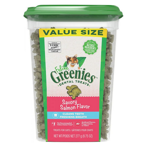 Product Description FELINE GREENIES Savory Salmon Flavor Dental Cat Treats were designed to help keep your cat’s teeth clean and healthy. The crunchy texture of these irresistible cat snacks helps clean teeth, reduce tartar buildup, and freshen cat breath, letting you enjoy cuddle time even more. Made with natural ingredients plus vitamins, minerals, and other nutrients, these tasty natural dental treats are nutritionally complete and balanced for adult cats. Plus, FELINE GREENIES Dental Treats contain less than 2 calories per treat and are the #1 vet recommended feline dental treat.* For some healthy play, try placing a few cat treats inside a treat dispenser toy and watch your cat chase and swat away. Give your cat FELINE GREENIES Dental Treats, and you're sure to hear happy purrs of joy. FELINE GREENIES Daily Dental Treats... for healthy and happy dental care. * Among U.S. veterinarians who recommend dental treats for at-home oral care This bulk tub contains 9.75 oz. of FELINE GREENIES Crunchy Dental Treats in Savory Salmon Flavor. Crunchy texture helps clean teeth, reduce tartar buildup, and freshen breath. The #1 vet-recommended feline dental treat*. Made with natural ingredients plus vitamins, minerals, and other nutrients; nutritionally complete and balanced for adult cats. This tasty cat treat has no artificial flavors, has no artificial preservatives, and contains less than 2 calories per treat. Dental Care. Natural. Product Benefits Ingredients Suggestions Special Note Warnings DisclaimerPeta2z.com offers nationally branded products that are produced according to manufacturing standards set by regulators at everyday low prices. Do not use unproven, unbranded products, which can pose serious risks to your health.