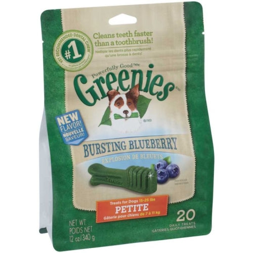 Product Description One GREENIES Dental Treat a day is all it takes for clean teeth, fresh breath and a happy dog. Your dog can't wait to sink their teeth into these delicious dental dog chews because they feature a delightfully chewy texture that fights plaque and tartar. Irresistibly tasty and incredibly powerful, GREENIES Treats for Dogs are recommended by veterinarians for at-home oral care. Best of all, these natural dog treats are made with highly soluble ingredients that are safe and easy to digest. Give your dog the mouth-wowing treat that helps promote their overall health with GREENIES Dog Treats. Contains one (1) 12 oz. 20-count pack of GREENIES Petite Natural Dog Dental Chews Blueberry Flavor; Natural Dog Treats Plus Vitamins, Minerals, and Other Nutrients. The unique texture of GREENIES Dog Chews cleans down to the gumline to fight plaque and tartar and freshen bad breath. GREENIES Treats for Dogs are veterinarian recommended and accepted by the VOHC (Veterinary Oral Health Council). These natural dog treats are packed with blueberry flavor dogs bark for. GREENIES Dog Treats are proudly crafted in USA facilities with quality ingredients from around the world. GREENIES Dog Treats are made with natural ingredients plus vitamins, minerals, & nutrients. Dental Care. Proudly crafted in USA facilities with quality ingredients from around the world. Natural. Product Benefits Ingredients Suggestions Special Note Warnings DisclaimerPeta2z.com offers nationally branded products that are produced according to manufacturing standards set by regulators at everyday low prices. Do not use unproven, unbranded products, which can pose serious risks to your health.