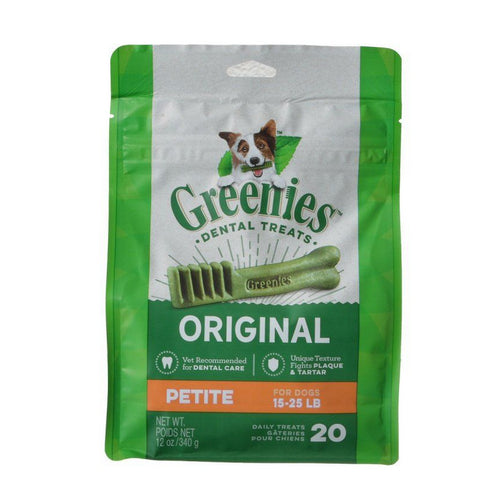 Product Description One GREENIES Dental Treat a day is all it takes for clean teeth, fresh breath and a happy dog. Your dog can't wait to sink their teeth into these delicious dental dog chews because they feature a delightfully chewy texture that fights plaque and tartar. Irresistibly tasty and incredibly powerful, GREENIES Treats for Dogs are recommended by veterinarians for at-home oral care. Best of all, these natural dog treats are made with highly soluble ingredients that are safe and easy to digest. Give your dog the mouth-wowing treat that helps promote their overall health with GREENIES Dog Treats. Contains one (1) 18 oz. 30-count pack of GREENIES Original Petite Natural Dental Dog Treats; Natural Dog Treats Plus Vitamins, Minerals and Other Nutrients. The unique texture of GREENIES Dog Chews cleans down to the gumline to fight plaque and tartar and freshen breath. GREENIES Treats for Dogs are veterinarian recommended and accepted by the Veterinary Oral Health Council (VOHC) for at-home oral care. Treat your dog deliciously with the great taste of GREENIES Original Dental Treats. GREENIES Dog Treats are proudly crafted in USA facilities with quality ingredients from around the world. GREENIES Dog Treats are made with natural ingredients plus vitamins, minerals, & nutrients. Dental Care. Proudly crafted in USA facilities with quality ingredients from around the world. Natural. Product Benefits Ingredients Suggestions Special Note Warnings DisclaimerPeta2z.com offers nationally branded products that are produced according to manufacturing standards set by regulators at everyday low prices. Do not use unproven, unbranded products, which can pose serious risks to your health.