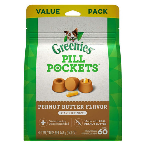 Product Description PILL POCKETS TURN PILL TIME INTO TREAT TIME. GREENIES Pill Pockets Treats for Dogs make it easy to give your dog medicine, with a tasty real peanut butter flavor they’re sure to love. Why hide your pet’s medicine in human foods like peanut butter or cheese when you can give them a healthy all natural dog treat, made with natural, real ingredients plus trace nutrients instead? Designed by veterinarians, GREENIES Pill Pockets Dog Treats mask the smell and taste of any medicine, taking the stress (and mess) out of giving your canine companion medicine. Whether for large breed or small dogs, these smaller-sized Pill Pockets for tablets make taking medicine a positive experience for your dog. And they’re easy to give: Simply drop a tablet into the Pill Pockets pouch, pinch the top half closed, give it to your pup, and poof: Watch their medicine disappear. GREENIES Pill Pockets are the ingenious way to give your dog their meds—and they’ll never know the difference. * Data on file at Mars Petcare US, Inc. 2018 Contains one (1) 15.8 oz. 60-count pack of GREENIES PILL POCKETS Capsule Size Natural Dog Treats Real Peanut Butter Flavor; MADE WITH NATURAL INGREDIENTS plus trace nutrients. GREENIES Pill Pockets are the tasty, smarter way to help your dog’s medicine go down at treatment time—without trying to hide pills in human food like messy peanut butter or cheese. Your dog won’t be able to sniff out the medicine: Pill Pockets mask the smell and taste, and come in an irresistible real peanut butter flavor for a stress- and mess-free experience for you both. These Pill Pockets Dog Treats are a cinch to use: Drop the medicine tablet inside the pill pouch, pinch it closed, and give your best friend a tasty snack. When it comes to meds, pets are smart—but you’re smarter: GREENIES Pill Pockets are a vet-recommended* medicating treat hack you and your dog will love. These easy-to-use medicating pouches make taking medicine a positive experience for your dog. Pill pockets turn pill time into treat time.. Natural. Made in the USA. Product Benefits Ingredients Suggestions Special Note Warnings DisclaimerPeta2z.com offers nationally branded products that are produced according to manufacturing standards set by regulators at everyday low prices. Do not use unproven, unbranded products, which can pose serious risks to your health.