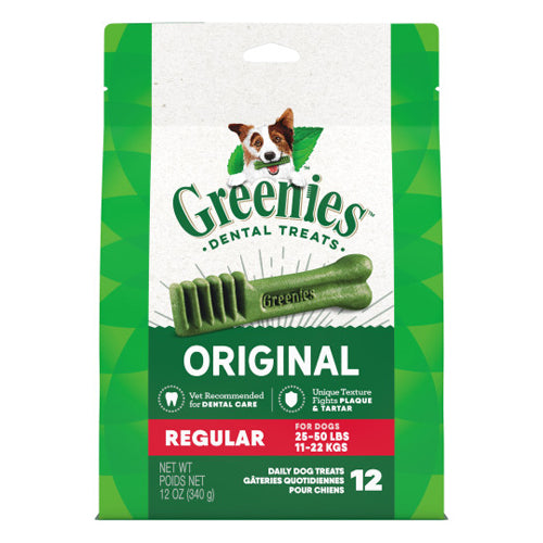 Product Description One GREENIES Dental Treat a day is all it takes for clean teeth, fresh breath and a happy dog. Your dog can't wait to sink their teeth into these delicious dental dog chews because they feature a delightfully chewy texture that fights plaque and tartar. Irresistibly tasty and incredibly powerful, GREENIES Treats for Dogs are recommended by veterinarians for at-home oral care. Best of all, these natural dog treats are made with highly soluble ingredients that are safe and easy to digest. Give your dog the mouth-wowing treat that helps promote their overall health with GREENIES Dog Treats. Contains one (1) 12 oz. 12-count pack of GREENIES Original Regular Size Natural Dental Dog Treats; Natural Dog Treats Plus Vitamins, Minerals and Other Nutrients. The unique texture of GREENIES Dog Chews cleans down to the gumline to fight plaque and tartar and freshen breath. GREENIES Treats for Dogs are veterinarian recommended and accepted by the Veterinary Oral Health Council (VOHC) for at-home oral care. Treat your dog deliciously with the great taste of GREENIES Original Dental Treats. GREENIES Dog Treats are proudly crafted in USA facilities with quality ingredients from around the world. GREENIES Dog Treats are made with natural ingredients plus vitamins, minerals, & nutrients. Dental Care. Proudly crafted in USA facilities with quality ingredients from around the world. Natural. Product Benefits Ingredients Suggestions Special Note Warnings DisclaimerPeta2z.com offers nationally branded products that are produced according to manufacturing standards set by regulators at everyday low prices. Do not use unproven, unbranded products, which can pose serious risks to your health.