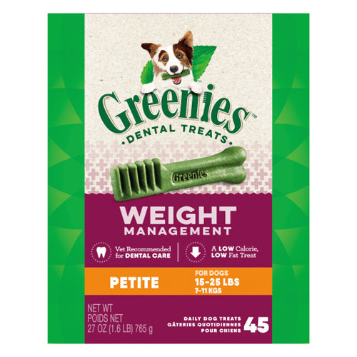 Product Description One GREENIES Weight Management Dental Treat is all it takes for clean teeth, fresh breath, and a happy dog. Your small dog can't wait to sink their teeth into these delicious dental dog treats because they feature a unique texture that's not only enjoyable to chew, but also fights plaque and tartar. Best of all, these natural treats for overweight dogs contain fewer calories and feature metabolism-boosting L-carnitine to help overweight or less active dogs achieve and maintain a healthy weight. Irresistibly tasty and incredibly powerful, GREENIES Treats for Dogs are also vet-recommended for at-home oral health care and accepted by the VOHC (Veterinary Oral Health Council.) Give your dog the mouth-wowing treat that helps promote their overall health with GREENIES Dog Treats. Great for small breeds and dogs between 15 and 25 lbs. Natural Dog Treats Plus Vitamins, Minerals, and Other Nutrients. Contains one (1) 27 oz. 45-count pack of GREENIES Weight Management Petite Dental Dog Treats; Natural Dog Treats Plus Vitamins, Minerals, and Other Nutrients. The unique texture of GREENIES Dog Chews cleans down to the gumline to fight plaque and tartar and freshen bad breath. GREENIES Treats for Dogs are veterinarian recommended and accepted by the VOHC (Veterinary Oral Health Council). Metabolism-boosting L-carnitine and fewer calories make this a great low-calorie dog treat for little dogs that are watching their figure. The great flavor of these low-fat dog treats will make their tail wag. GREENIES Dog Treats are proudly crafted in USA facilities with quality ingredients from around the world. GREENIES Dog Treats are made with natural ingredients plus vitamins, minerals, & nutrients. Dental Care. Proudly crafted in USA facilities with quality ingredients from around the world. Weight Control. Natural. Product Benefits Ingredients Suggestions Special Note Warnings DisclaimerPeta2z.com offers nationally branded products that are produced according to manufacturing standards set by regulators at everyday low prices. Do not use unproven, unbranded products, which can pose serious risks to your health.