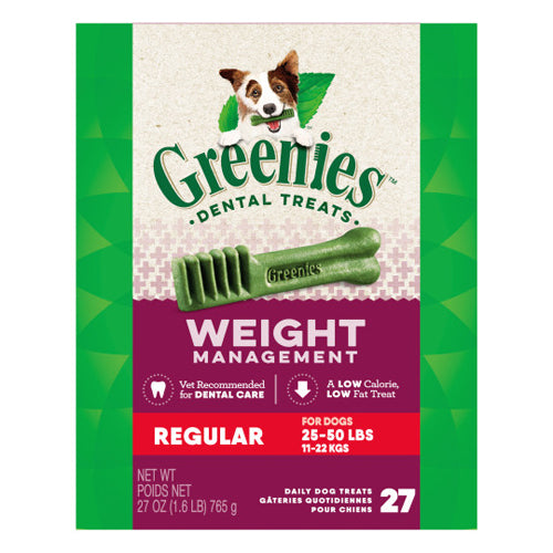 Product Description One GREENIES Weight Management Dental Treat is all it takes for clean teeth, fresh breath, and a happy dog. Your dog can't wait to sink their teeth into these delicious dental dog treats because they feature a unique texture that's not only enjoyable to chew, but also fights plaque and tartar. Best of all, these natural treats for overweight dogs contain fewer calories and feature metabolism-boosting L-carnitine to help overweight or less active dogs achieve and maintain a healthy weight. Irresistibly tasty and incredibly powerful, GREENIES Treats for Dogs are also vet-recommended for at-home oral health care and accepted by the VOHC (Veterinary Oral Health Council.) Give your dog the mouth-wowing treat that helps promote their overall health with GREENIES Dog Treats. Natural Dog Treats Plus Vitamins, Minerals, and Other Nutrients. Contains one (1) 27 oz. 27-count pack of GREENIES Weight Management Regular Size Natural Dental Dog Treats; Natural Dog Treats Plus Vitamins, Minerals, and Other Nutrients. The unique texture of GREENIES Dog Chews cleans down to the gumline to fight plaque and tartar and freshen bad breath. GREENIES Treats for Dogs are veterinarian recommended and accepted by the VOHC (Veterinary Oral Health Council). Metabolism-boosting L-carnitine and fewer calories make this a great low-calorie dog treat for dogs that are watching their figure. The great flavor of these low-fat dog treats will make their tail wag. GREENIES Dog Treats are proudly crafted in USA facilities with quality ingredients from around the world. GREENIES Dog Treats are made with natural ingredients plus vitamins, minerals, & nutrients. Dental Care. Proudly crafted in USA facilities with quality ingredients from around the world. Weight Control. Natural. Product Benefits Ingredients Suggestions Special Note Warnings DisclaimerPeta2z.com offers nationally branded products that are produced according to manufacturing standards set by regulators at everyday low prices. Do not use unproven, unbranded products, which can pose serious risks to your health.