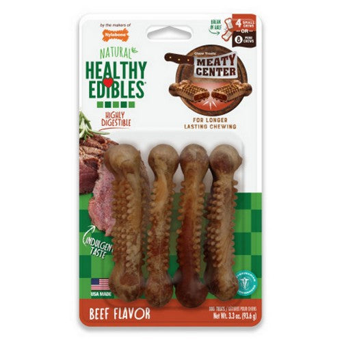 Product Description Our meatiest creation yet, Healthy Edibles Meaty Center treats are the ultimate savory indulgence, featuring a crave-worthy meaty center packed with irresistible flavor! These dog treats are as healthy as they are delicious, containing limited ingredients and no artificial colors, flavors, or preservatives. Plus, each dog treat is highly digestible and features dental nubs that help clean teeth through chewing action. Proudly made in the USA, Nylabone's long-lasting dog chew treats are great for rewarding and occupying your meat-loving furry friend!We proudly craft all Healthy Edibles dog treats in the United StatesLong-lasting treats feature an indulgent meaty centerNatural dog treats contain limited ingredients and no artificial colors, flavors, or preservativesDental nubs help clean teeth as dogs chewEach treat includes a break point for more treating occasionsSize Medium chew treats are intended for dogs over 30 poundsEdible dog bones contain tasty meaty flavor furry friends loveContains 2 treats that can be broken in half for 4 smaller treats Product Benefits Ingredients Suggestions Battery Required:No. Batteries Included: No. Use Instructions: Best if used within one month after opening product. Storage Instructions:Store in a cool dry place. Best if used within one month after opening product. Feeding Instructions: Be sure your dog has access to plenty of fresh water. Natural color may stain light-colored surfaces. Supervise the use of all edible chews to ensure that your dog does not bite off pieces too large to swallow. These chews are recommended for dogs with all of their permanent teeth (usually around 6 months). Feed as a treat. This product is not intended to be fed as a meal. Special Note Warnings DisclaimerPeta2z.com offers nationally branded products that are produced according to manufacturing standards set by regulators at everyday low prices. Do not use unproven, unbranded products, which can pose serious risks to your health.