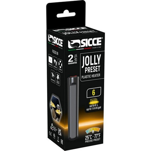 Product Description JOLLY PRESET heaters are configured at 25 °C (77 °F) to ensure an ideal temperature in small aquariums. The new JOLLY is unbreakable thanks to a plastic shell. They are compact with minimum space requirements, practical, precise, and reliable because the temperature is pre-set and regulated by an integrated circuit. Available in multiple wattages for multiple small aquarium sizes, the JOLLY PRESET is an ideal heater for Betta fish, Neon fish, turtles, and amphibians. Temperature is pre-set to 25°C (77°F) and regulated by an integrated circuit. Unbreakable plastic shell. Compact with minimum space requirements. Practical, precise, and reliable. Ideal heater for Betta fish, Neon fish, turtles, and amphibians. Product Benefits Ingredients Suggestions Mounting Direction: Vertical; Horizontal. Special Note Warnings DisclaimerPeta2z.com offers nationally branded products that are produced according to manufacturing standards set by regulators at everyday low prices. Do not use unproven, unbranded products, which can pose serious risks to your health.