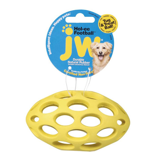 Product Description JW Hol-ee Football is a fun, versatile dog toy with the durability you've been searching for. Rubber gives it strength, bounce, and a soft texture while the unique open design allows you to stash some treats inside for hours of entertainment for your dog. This is a non toxic, durable, rubber, super-stretchy multi-purpose dog toy. It's a fantastic treat ball, wonderful training aid, great for fetch, toss and tug, chewing and teething. Ships in assorted colors. Product Benefits Ingredients Suggestions Special Note Warnings DisclaimerPeta2z.com offers nationally branded products that are produced according to manufacturing standards set by regulators at everyday low prices. Do not use unproven, unbranded products, which can pose serious risks to your health.