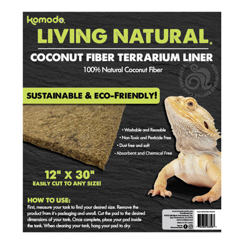 Product Description Komodo Coconut Fiber Terrarium Liners are an easy, sustainable, and eco-friendly solution to your pet's bedding. The liner is made of 100% natural coconut fiber and is non-toxic and pesticide free. The liner is absorbent and chemical free and can be washed and reused. HOW TO USE: First, measure your tank to find your desired size. Remove the product from its packaging and unroll. Cut the liner to the desired dimensions of your tank. Once complete, place your liner inside the tank. When cleaning your tank, hang your liner to dry. Clean, wash, dispose of, and replace as needed. Easy, sustainable, and eco-friendly solution. Made of 100% natural coconut fiber. Non-toxic and pesticide free. Liner is absorbent and chemical free and can be washed and reused. Product Benefits Ingredients Suggestions Special Note Warnings DisclaimerPeta2z.com offers nationally branded products that are produced according to manufacturing standards set by regulators at everyday low prices. Do not use unproven, unbranded products, which can pose serious risks to your health.