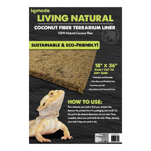 Product Description Komodo Coconut Fiber Terrarium Liners are an easy, sustainable, and eco-friendly solution to your pet's bedding. The liner is made of 100% natural coconut fiber and is non-toxic and pesticide free. The liner is absorbent and chemical free and can be washed and reused. HOW TO USE: First, measure your tank to find your desired size. Remove the product from its packaging and unroll. Cut the liner to the desired dimensions of your tank. Once complete, place your liner inside the tank. When cleaning your tank, hang your liner to dry. Clean, wash, dispose of, and replace as needed. Easy, sustainable, and eco-friendly solution. Made of 100% natural coconut fiber. Non-toxic and pesticide free. Liner is absorbent and chemical free and can be washed and reused. Product Benefits Ingredients Suggestions Special Note Warnings DisclaimerPeta2z.com offers nationally branded products that are produced according to manufacturing standards set by regulators at everyday low prices. Do not use unproven, unbranded products, which can pose serious risks to your health.
