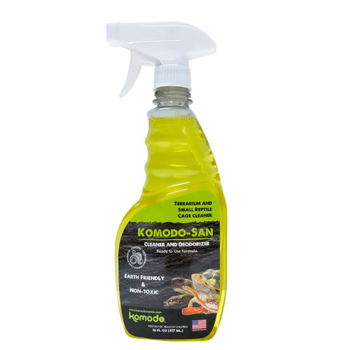 Product Description The Komodo 16oz San Spray eliminates Salmonella and 99.9% of other bacteria and viruses while cleaning your reptile enclosures. Ready to use and wipe formula with no rinsing necessary. No worries needed when knowing you are providing a safe environment for your pet and your family. USA Made. Eliminates Salmonella and 99.9% of other bacteria and viruses while cleaning your reptile enclosures. Ready to use and wipe formula with no rinsing necessary. No worries needed when knowing you are providing a safe environment for your pet and your family. USA Made. Product Benefits Ingredients Suggestions Special Note Warnings DisclaimerPeta2z.com offers nationally branded products that are produced according to manufacturing standards set by regulators at everyday low prices. Do not use unproven, unbranded products, which can pose serious risks to your health.
