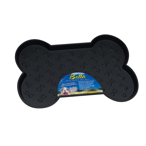 Product Description Bone-shaped Bella Spill-Proof Dog Mats stylishly prevents splashes and retains spills. Bella Spill-Proof Dog Mats have raised edges for maximum spill capacity, a slip-resistant, bone-embossed surface, and anti-skid feet to prevent slips, slides, noise and floor damage. Non-toxic, BPA-free and quality tested. For both indoor and outdoor use. Cleans easily – just rinse with water. Product Benefits Ingredients Suggestions Special Note Warnings DisclaimerPeta2z.com offers nationally branded products that are produced according to manufacturing standards set by regulators at everyday low prices. Do not use unproven, unbranded products, which can pose serious risks to your health.