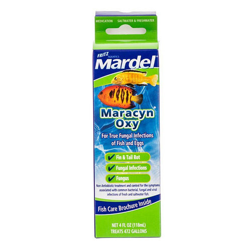Product Description Maracyn oxy successfully controls fungus infections caused by saprolegnia, icthyosporidium, egg fungus and related species, and common bacterial infections. It slowly releases small amounts of a stabilized oxygen chlorine combination which, when used as directed, has an unusual ability to treat a wide variety of tropical fish diseases. Fungus infections are usually found at the site of an injury or recent attack from parasites. Product Benefits For True Fungal Infections Of Fish And Eggs. Fin And Tail Rot. Fungal Infections. Fungus. Non Antiobiotic Treatment And Control For The Symptom Associated With Common Bacterial, Fungal And Viral Infections Of Fresh And Saltwater Fish. Ingredients Ingredients: Sodium Chlorite. Suggestions The use of a hospital tank is recommended. It is always wise to check water quality levels to ensure they are within their acceptable ranges before administering any water treatment. No water changes, ph or temperature adjustments necessary if readings are in ideal range. Maintain normal filtration and air.Use half capful 2.5 ml per 10 gallons of water. Repeat as needed for not more than 5 days. Special Note Warnings Keep out reach of children. For aquarium use only. DisclaimerPeta2z.com offers nationally branded products that are produced according to manufacturing standards set by regulators at everyday low prices. Do not use unproven, unbranded products, which can pose serious risks to your health.