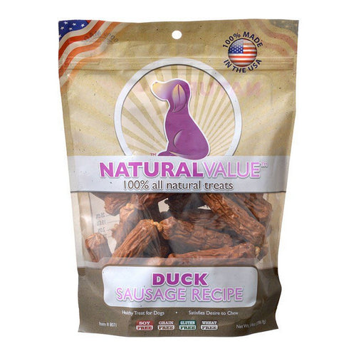 Product Description Natural Value Duck Sausages are made in the U.S.A. – proof that healthy, safe U.S.A. made dog treats can be affordable. Cooked on open grilling racks to reduce fat and give them a delicious flavor, our Duck Sausages are sure to be your dog’s favorite treat. Since they’re made in the U.S.A., they should be your favorite too. Made in the U.S.A.. Healthy, safe, and affordable. Cooked on open grilling racks to reduce fat and give them a delicious flavor. perfect for any age or size dog. Product Benefits Ingredients Suggestions Special Note Warnings DisclaimerPeta2z.com offers nationally branded products that are produced according to manufacturing standards set by regulators at everyday low prices. Do not use unproven, unbranded products, which can pose serious risks to your health.