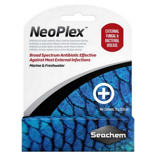 Product Description NeoPlex is a broad spectrum antibiotic effective against most external infections of both marine and freshwater fish. Used as directed, NeoPlex will not discolor the water or damage the filter bed. It is well tolerated by invertebrates, although delicate species may be stressed. Product Benefits Ingredients Ingredients: Neomycin Sulfate; Excipients. Suggestions Use Instructions: Dosing in Water: Remove all invertebrates - these are extremely sensitive to medication. Turn off UV filters, ozone filters, and remove chemical filtration like MatrixCarbon and Purigen. Use 1 measure (included) per every 8 L (2 US gallons). Repeat this dose every 7 days to a maximum of 3 weeks. This will treat external bacterial infections.After Treating: When the treatment period is over, NeoPlex can easily be removed using activated filter carbon like MatrixCarbon. It does not linger in the substrate or filter media of the tank. Remove with carbon before turning on UV. Feeding Instructions: Dosing in Food: Feed the medicated food mix every day until the infection clears or up to 1 week. This will treat internal bacterial infections. This medicated food can be refrigerated or frozen between feedings.1 scoop NeoPlex 1 scoop Focus 1 tbsp food (preferably pellets or frozen food)A few drops of water if using a dry foodTo enhance palatability use with GarlicGuard or Entice. Special Note Warnings DisclaimerPeta2z.com offers nationally branded products that are produced according to manufacturing standards set by regulators at everyday low prices. Do not use unproven, unbranded products, which can pose serious risks to your health.