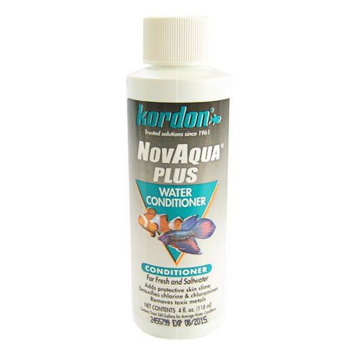 Product Description Kordon novaqua plus is the latest of technological developments in water conditioners for aquariums and ponds. Novaqua plus dechlorinates water, removes toxic heavy metals including copper and adds electrolytes and a protective slime coat vitamins and echinacea. Tap water may be safe for humans, but in almost all localities it is not safe for fishes and aquatic invertebrates. Tap water needs to be modified by using novaqua plus when setting up aquariums or making water changes, and when preparing salt water for marine aquariums. Product Benefits 1. Detoxifies Heavy Metals From Tap Water. 2. Dismantles Chloramine In Tap Water. 3. Detoxifiess All Chlorine From Tap Water. 4. Provides Protective Slime Coatings For Fishes. 5. Is Compatible With All Of Kordons Water Conditioners And Fish Treatments. Ingredients Suggestions Standard doses for regular (aquarium) novaqua plus use 10 drops per gallon, or 1 teaspoon (approximately 5 ml) per 10 gallons of water, or 1 tablespoon (approx 15 ml) per 30 gallons of water, or 1 fl oz for 60 gallons. When used at the recommended standard dose, 4 ounces of regular novaqua plus will treat 240 gallons of water, 1 gallon of regular novaqua plus will treat 7,680 gallons of water, 5 gallons of regular novaqua plus will treat 38,400 gallons of water.Suggested usage in aquariums and ponds. Special Note Warnings No cautions are required in the use of this product. Novaqua plus does not reach toxic levels with regular use or upon accidental or purposeful overdose. It is safe for reef and live rock aquariums. Novaqua plus is non toxic to humans, pets and aquatic life. DisclaimerPeta2z.com offers nationally branded products that are produced according to manufacturing standards set by regulators at everyday low prices. Do not use unproven, unbranded products, which can pose serious risks to your health.