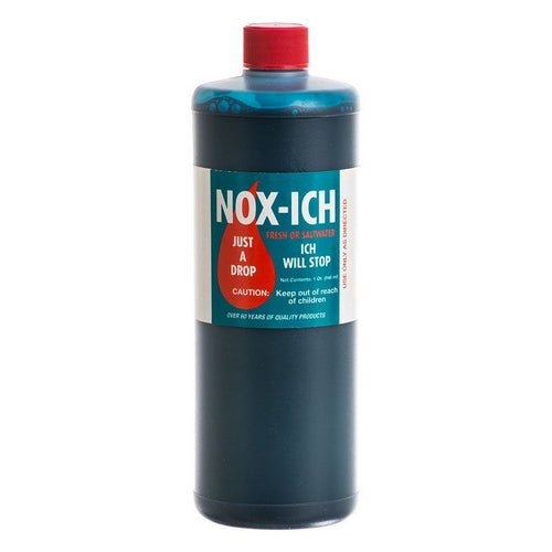 Product Description Nox-Ich is your answer to killing external parasites upon contact. It is especially effective against the common occurring parasite ICH. Add just one drop per gallon to eliminate unwanted visitors to your aquarium. Nox-Ich is also effective against Velvet Fin Rot Chilondonella Trichondina as well as many forms of fungi. Product Benefits Ingredients Suggestions Use Instructions:Add 1 drop per gallon of water for control of external parasitic diseases including Ich and Velvet. Use for 3 consecutive days. If problem persists after initial treatment, skip one day and treat again for another 3 days. Do not increase dosage. Use 1/2 the amount or less for sensitive fish including Tetras, scale less or bottom fish. Remove carbon from filter during treatment. Saltwater: Add 2 drops per gallon for 3 consecutive days. Special Note Warnings DisclaimerPeta2z.com offers nationally branded products that are produced according to manufacturing standards set by regulators at everyday low prices. Do not use unproven, unbranded products, which can pose serious risks to your health.