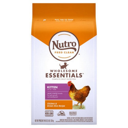 Product Description Each NUTRO WHOLESOME ESSENTIALS Dry Cat Food recipe starts with a high-quality protein source and is made with non-GMO ingredients.* This premium natural cat food features real chicken as the ingredient, omega-3 fatty acids for growth and development, and essential antioxidants like DHA for a healthy immune system. This kitty kibble is also crafted with calcium to build strong bones and joints in your growing kitten. NUTRO Dry Cat Foods are made with quality ingredients carefully sourced from a trusted network of farmers and suppliers and have no corn, wheat, or soy protein, no chicken by-product meal, and no artificial preservatives, flavors, or colors. Give your baby cat a complete, nutritious meal every time with NUTRO WHOLESOME ESSENTIALS Kitten Dry Cat Food. * Trace amounts of genetically modified material may be present due to potential cross-contact during manufacturing. Contains one (1) 3 lb. bag of NUTRO WHOLESOME ESSENTIALS Kitten Chicken & Brown Rice Recipe Natural Cat Food Plus Vitamins, Minerals, & Other Nutrients. Real chicken is the ingredient in this delicious kitten food that’s rich in nutrients and full of flavor. Features calcium to build strong bones and joints and essential antioxidants for healthy immunity. Wholesome kitten food rich in omega-3 fatty acids like DHA for growth and development. Made with non-GMO ingredients* from trusted farmers and suppliers (* Trace amounts of genetically modified material may be present due to potential cross-contactduring manufacturing.). NO corn, wheat, or soy protein, NO chicken by-product meal, NO artificial preservatives, flavors, or colors… just real food for your kitty to enjoy. Protein Rich. Development (for kitten). Bone Health. Healthy Immune System. GMO-Free. Product Benefits Ingredients Ingredients: Chicken;Chicken Meal;Pea Protein;Chicken Fat (preserved with Mixed Tocopherols);Brewers Rice;Whole Brown Rice;Potato Protein;Whole Grain Oatmeal;Dried Plain Beet Pulp;Fish Meal;Dehydrated Alfalfa Meal;Natural Flavor;Soybean Oil (preserved with Mixed Tocopherols);Potassium Chloride;Choline Chloride;Salt;Fish Oil (preserved with Mixed Tocopherols);DL-Methionine;Mixed Tocopherols and Citric Acid (preservatives);Taurine;Zinc Sulfate;Vitamin E Supplement;L-Ascorbyl-2-Polyphosphate;Iron Amino Acid Chelate;Yucca Schidigera Extract;Vitamin B12 Supplement;Copper Amino Acid Chelate;Niacin Supplement;Manganese Amino Acid Chelate;Biotin;Riboflavin Supplement (Vitamin B2);D-Calcium Pantothenate;Thiamine Mononitrate (Vitamin B1);Vitamin A Supplement;Pyridoxine Hydrochloride (Vitamin B6);Sodium Selenite;Potassium Iodide;Vitamin D3 Supplement;Folic Acid;Rosemary Extract. Suggestions Storage Instructions: Store in cool, dry place. Feeding Instructions: These are the recommended feeding amounts based on the ideal body condition for kittens and pregnant/nursing adult cats of various weights. Individual cats’ energy requirements may differ. Adjust the amount fed to obtain or maintain your cat’s optimum weight. Keep fresh drinking water available at all times, provide plenty of exercise and see your veterinarian regularly. Every cup of our food is nutrient dense so your cat gets the right amount of calories in a complete and nutritious meal.To help maintain freshness, seal bag tightly and store in a cool, dry location.Kittens: Serve dry or slightly moistened in multiple meals throughout the day. Pregnancy/Lactation: During pregnancy, offer 50% more and during lactation offer at least two to three times more than the amount shown for kittens 40 to 52 weeks of age.Suggested Amounts to Feed Per Day (Cups)‡Kitten Age (Weeks) Weight of Kitten Feeding AmountUp to 8 Up to 2 lbs. 1/38 - 16 2-4 lbs. 1/216 - 40 4-9 lbs. 2/340 - 52 9-16 lbs. 3/4 Use a standard 8 oz. measuring cup which holds 3.96 oz. of NUTRO WHOLESOME ESSENTIALS Kitten Chicken & Brown Rice Recipe Cat Food.Transitioning To Our Food:If feeding NUTRO Cat Food for the first time or changing recipes, we suggest you blend increasing amounts of the new recipe with your old cat food for six days. Special Note Warnings DisclaimerPeta2z.com offers nationally branded products that are produced according to manufacturing standards set by regulators at everyday low prices. Do not use unproven, unbranded products, which can pose serious risks to your health.