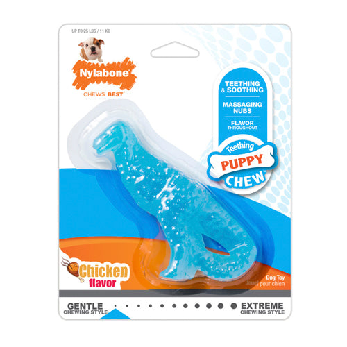 Product Description The Nylabone Dental Dino Puppy Chew Toy satisfies your pup’s natural urge to chew with irresistible chicken flavor throughout and a fun T-Rex shape. Made just for teething puppies, its gentle nubs promote clean teeth and control plaque and tartar buildup. This dental chew toy is the perfect pastime for playful pups who could use some teething relief. These doggy dental chews make dog dental care simple and tasty! Teething Puppy Bones: Gentle puppy chew toys that ease pain during the teething stage. Keeps puppies busy and helps prevent destructive chewing. Flexible chew toy helps with puppy teething while cleaning teeth and freshening breath. Chew toy for puppies up to 25 pounds. Flavored dog chew contains delicious chicken flavor dogs love. Chew toy dimensions: Out of package measures 4.63 long x 1.25 wide x 1.13 high. Product Benefits Ingredients Suggestions Special Note Warnings DisclaimerPeta2z.com offers nationally branded products that are produced according to manufacturing standards set by regulators at everyday low prices. Do not use unproven, unbranded products, which can pose serious risks to your health.