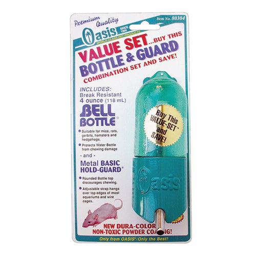 Product Description Oasis Value-Sets include genuine Oasis Bell-Bottle Water Bottles and Basic Hold-Guards paired for a perfect fit. Bell-Bottles feature rounded tops to discourage chewing and are color coordinated with the Hold-Guard. The Hold-Guard is sturdy metal with non-toxic powder coating. The guard hangs inside the pet's cage and protects water bottle and cap from chewing biting and gnawing damage. The easy to adjust hanger strap fits many sizes of aquarium-type pet environments (hangs over the upper edge) or wire cages (hanger straps slides through the wird side.) Suitable for fancy mice fancy rats gerbils hamsters sugar gliders and hedgehogs. 4 ounce Bell-Bottle with matching Hold-Guard. Product Benefits Ingredients Suggestions Special Note Warnings DisclaimerPeta2z.com offers nationally branded products that are produced according to manufacturing standards set by regulators at everyday low prices. Do not use unproven, unbranded products, which can pose serious risks to your health.