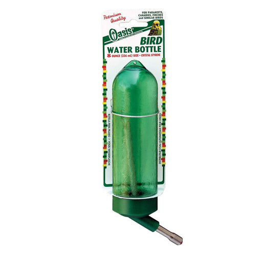 Product Description Oasis Bird Bottles feature the Cherry-Red drinking tip (a lower red nylon ball that visually attracts birds and 2 stainless steel balls above that for weight.) This drinking tube-style offers a sanitary clean water supply that is not dirtied by seed seed hulls or droppings. The traditional green bottle color protects water supply from damage by sunlight thereby preserving vitamin and/or medication potency and inhibiting bacterial growth. A floating white ball indicates water level at a glance. Each bottle serves between 1 to 4 birds depending on species & diet. 4 ounce size - usually used for canaries finches parakeets (budgies) and lovebirds. Product Benefits Ingredients Suggestions Special Note Warnings DisclaimerPeta2z.com offers nationally branded products that are produced according to manufacturing standards set by regulators at everyday low prices. Do not use unproven, unbranded products, which can pose serious risks to your health.