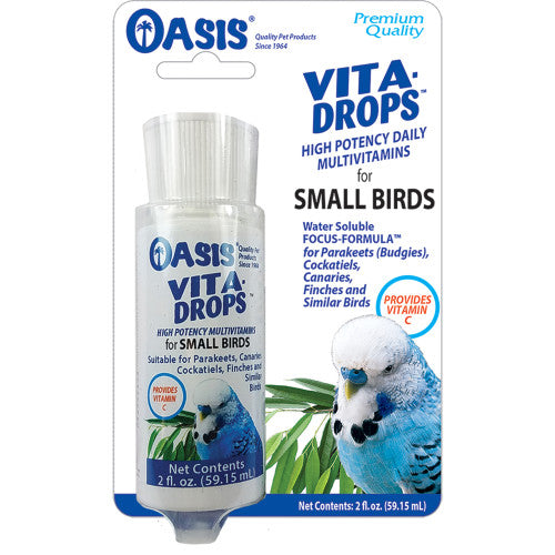 Product Description Oasis Vita-Drops for Small Birds is a multi-purpose balanced supplement formulated especially for pet birds - contains all essential vitamins. Convenient water soluble formula assures birds receive their daily intake with each sip of water. Doses have been adjusted according to different drinking styles/behaviors of various birds. Vita-Drops for Small Birds promotes normal growth development full feathering and brilliant color. This product coordinates with today's cage-bird advanced diets. Suitable for canaries finches parakeets (budgies) lories cockatiels lovebirds and simlar sized caged birds.. 2 fluid ounces ina dropper-cap bottle. Product Benefits Ingredients Suggestions Special Note Warnings DisclaimerPeta2z.com offers nationally branded products that are produced according to manufacturing standards set by regulators at everyday low prices. Do not use unproven, unbranded products, which can pose serious risks to your health.