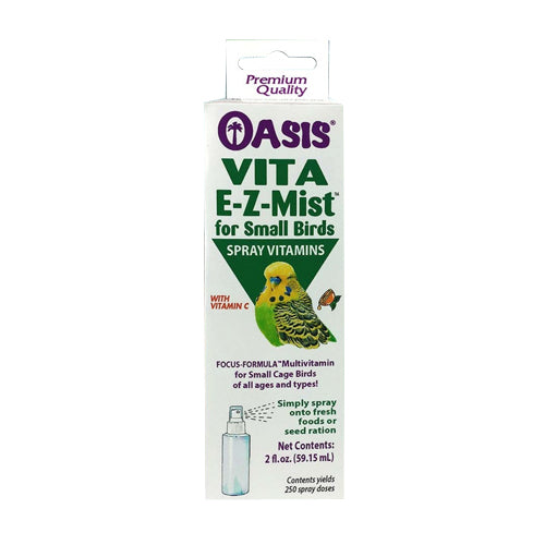Product Description Small Bird Vita E-Z-Mist 2 Oz Is The Same Great Quality Product You Have Come To Trust In Oasis Vita Drops, Now As A Handy 2 Oz Spray On. Great For Use On Fresh Foods, Seeds, Pellets Or Hay. Product Benefits Ingredients Suggestions Use Instructions:Simply spray onto fresh foods or seed ration Special Note Warnings DisclaimerPeta2z.com offers nationally branded products that are produced according to manufacturing standards set by regulators at everyday low prices. Do not use unproven, unbranded products, which can pose serious risks to your health.