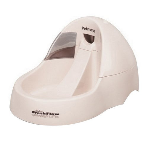 Product Description The Petmate Deluxe Fresh Flow Pet Fountain is a purifying pet water fountain designed to keep your pet cool and hydrated, especially during the warmer months. Pet parents and pets appreciate the slope design that provides a natural continuous flow of circulating filtered, oxygenated water to ensure that your dog or cat stays hydrated with a unique no splash water slide. Support your pet's health and wellness with this innovative water fountain. Continuous running water attracts your pet and encourages them to drink more water. Holds a large amount of water and is ideal for multiple cat or dog households. The quietly running fountain plugs into a standard household AC outlet. Automatically release more water when needed. Replaceable charcoal filter (change filter every 30 days to ensure freshness). Large has a 108 oz. cup capacity and the Jumbo a 216 oz. cup capacity. Product Benefits Ingredients Suggestions Use Instructions: Pump may take 2-3 minutes before it begins circulating water. This allows time for air to be removed from pump. The pump is silent. You will not hear anything except the flowing of water down the slope.Mineral build-up from tap water or water from other sources can ruin the pump. If hard water is a problem, bottled water is recommended. The pump may need occasional cleaning to remove build up, especially when using hard water. If debris is caught in the intake vents of the pump, disconnect the pump from any power sources and rinse the pump under clean running water. Check strainer and intake vents once a week for pet hair and debris. Remove as needed.Always unplug unit before performing any type of maintenance.Filter Maintenance: Check charcoal filter after two weeks. Replace filter once a month for usage by one pet. Homes with multiple pets will require more frequent replacement.Cleaning: Bowl, reservoirs and all plastic parts may need to be cleaned with mild dish soap. Do not place in dishwasher.Damage: Inspect all plastic parts at this time for cracks or damage that could facilitate water leaking onto floor.Adding Water: Add water to storage reservoir when it appears low. You must remove the reservoir to add water to it. Water may also be added to bowl by pouring slowly from a cup directly into the bowl.Pump Cleaning: Unplug unit. Remove pump intake top cover. Use fingernail to pry second cover up. Remove second cover. Remove impeller. Soak in solution of two parts vinegar and one part water for 2-3 hours. Clean impeller with Q-tip. Rinse well and reassemble. Care and Cleaning Instructions: Bowl, reservoirs and all plastic parts may need to be cleaned with mild dish soap. Do not place in dishwasher.1. Unplug unit. Remove pump intake top cover. 2. Use fingernail to pry second cover up. 3. Remove second cover. 4. Remove impeller. (May need tweezers) It is only held in by magnetic force.5. Soak in solution of 2 parts vinegar and 1 part water for 2-3 hours. Clean impeller tunnel with Q-tip. Rinse well; re-assemble wet. Special Note Warnings DisclaimerPeta2z.com offers nationally branded products that are produced according to manufacturing standards set by regulators at everyday low prices. Do not use unproven, unbranded products, which can pose serious risks to your health.